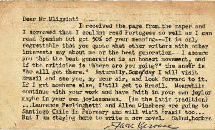 “Em 5 de dezembro de 1959, publiquei no Suplemento Dominical do Jornal do Brasil um artigo de página inteira intitulado “Jack Kerouac e as crianças do bop”. Resolvi mandar um recorte para Kerouac, endereçado à sua editora. Três semanas depois, para minha surpresa, recebi um cartão datilografado e assinado pelo autor de On the Road. No ano seguinte, botei o pé na estrada e o cartão ficou esquecido dentro de algum livro – acho que Mexico City Blues. Há pouco tempo, remexendo em velhos papeis topei com o cartão amarelecido do velho Jack. E despertei para alguns detalhes que na época não me chamaram atenção especial. A solidão de Kerouac, por exemplo. Em 1959 ele estava no auge da fama. Choviam os convites: para dar conferências, publicar novos livros, artigos e reportagens em revistas, entrevistas à televisão, discos de jazz-poetry e por aí afora. Os mass media tinham descoberto os beats e o seu papa, Kerouac. Com o dinheiro dos direitos autorais, ele comprou uma casa em Northport – em Long Island, perto de Nova York – uma casa cinzenta, com um quintal que dava para um campo de futebol, onde se instalou com a mãe. A eterna mãe, que logo impôs um acordo ao seu Ti Jean: ela cuidaria da casa se ele concordasse em ficar seis meses por ano longe da estrada, só para escrever. O que me comoveu no cartão de Kerouac é que ele foi postado às 6h30 da tarde, na véspera de Natal. Será que Jack não tinha coisa melhor a fazer naquele dia – logo ele, tãocatólico – do que mandar um cartão para um obscuro correspondente do outro lado do continente?”