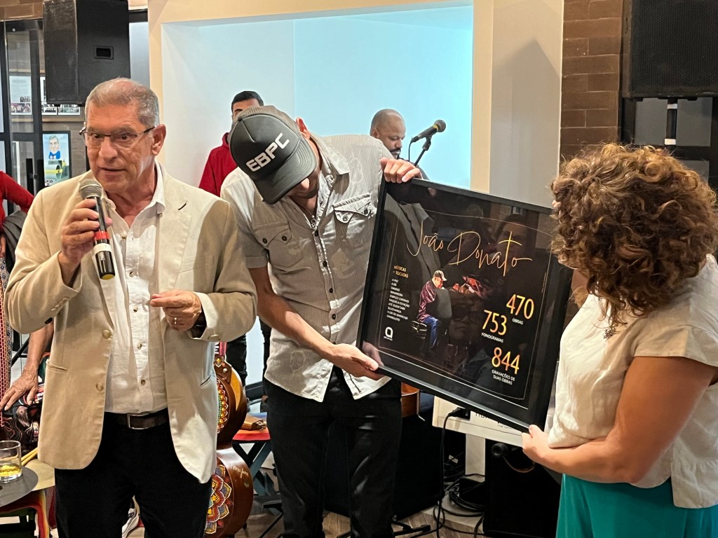 Também estiveram lá companheiros dos primeiros anos, ainda tocando muito, como Roberto Menescal e Maurício Einhorn. E a cineasta Tetê Moraes, o produtor Daniel Rodriguez… Por vídeo, o irmão Lysias Ênio (parceiro em clássicos como Até quem sabe e Amazonas) enviou belo e emocionado depoimento. A placa entregue a Ivone e Donatinho por Roberto Mello (diretor-presidente da Abramus) traz alguns números: 470 composições, 753 fonogramas e 844 gravações de sua obra.
