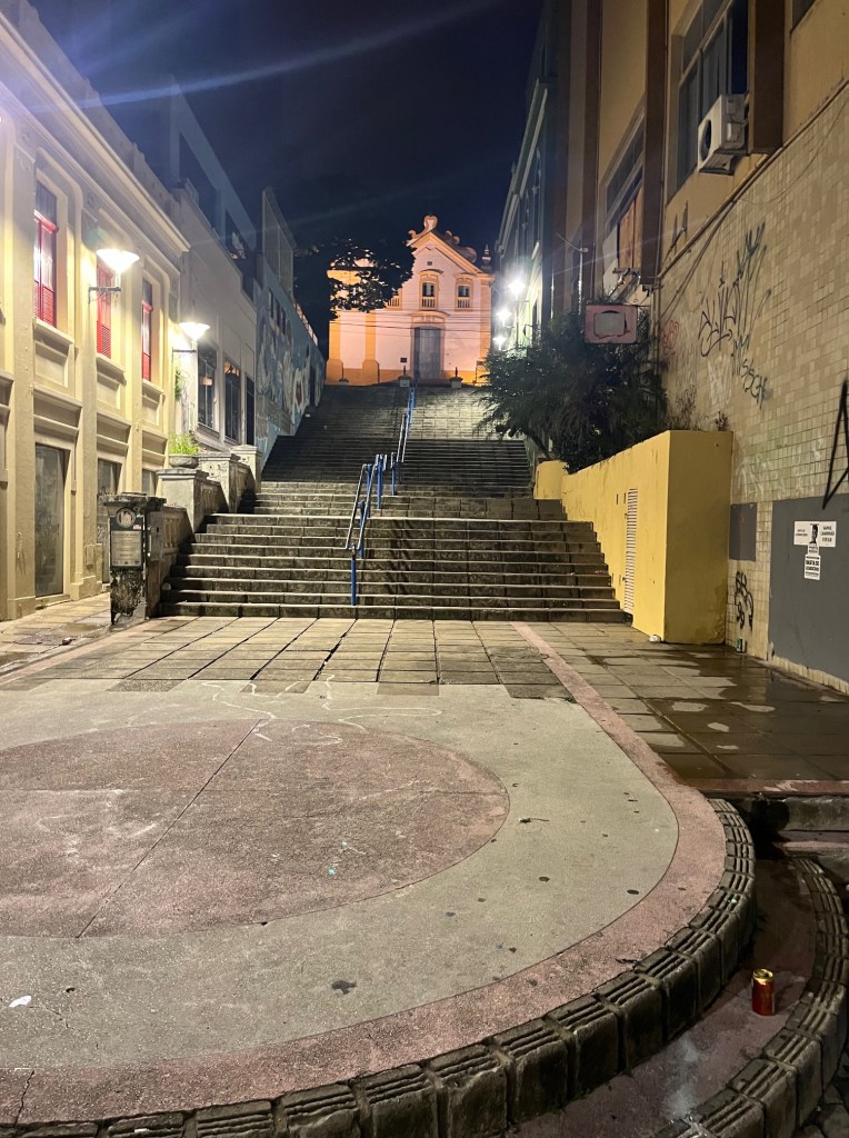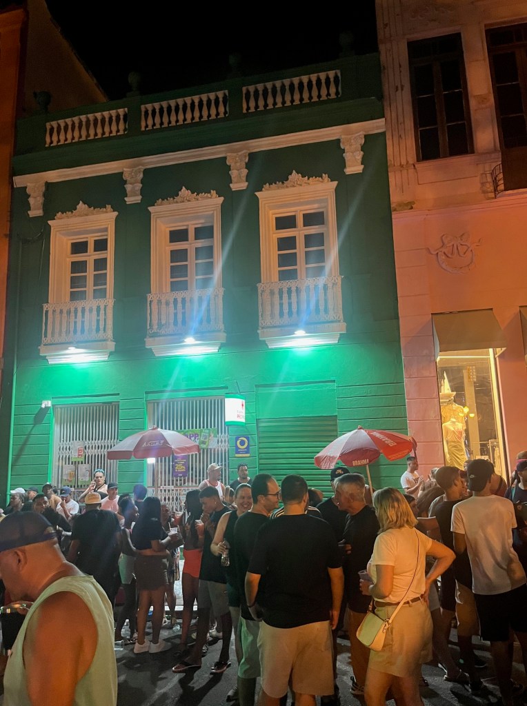 A peregrinação noturna e pré carnavalesca prossegue e chego ao casario ao lado da Catedral onde vô Miguel, como tantos imigrantes que começaram do zero, mascateando, teve seu último e mais próspero negócio, uma loja de tecidos. Enquanto registro a fachada, duas moças param e pedem que as fotografe também. Uma entrega o celular ao idoso desconhecido e trato de clicar, até que chegam dois rapazes e as desinibidas de Floripa correm para uma viela lateral anunciando aos berros aos amigos que vão se aliviar da cerveja acumulada. Afinal, é quase carnaval e o adorável aroma de cannabis também se espalha.