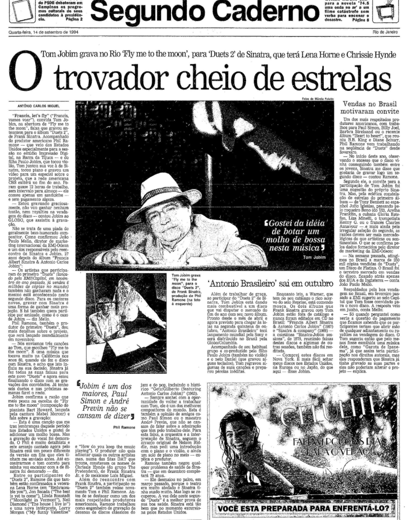 Já me encontrava na redação d’O Globo quando chegou a notícia da morte, o corpo inerte em um hospital de Nova York, a mesma cidade onde, 14 anos antes, num mesmo 8 de dezembro, John Lennon tinha sido assassinado. Lembro-me de que fizemos um obituário pífio no Segundo Caderno. “Hoje, enterramos um chato!”, falou em alto e péssimo som um dos responsáveis ao liberar para a gráfica nossa edição. O mesmo, meses depois, vaticinou que Kurt Cobain (que se suicidara oito meses antes) seria mais lembrado no futuro do que Tom. Imagino que o colega tenha revisto sua opinião, soterrada por centenas de evidências. Na manhã seguinte, fomos confrontados pelo JB, que (então ainda muito influente) dedicou a Jobim praticamente todo o jornal, cada editoria focando algo da personalidade e da obra do artista e ser humano que nos deixava aos 67 anos de vida. Dois meses antes, tivera meu último encontro com Tom, no estúdio na Barra da Tijuca onde ele botou voz em “Fly me to the moon”, o reencontro virtual com Frank Sinatra, no disco “Duets II”. Reproduzo aqui a reportagem que foi capa no Segundo Caderno de 14 de setembro de 1994.