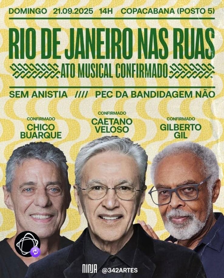 Cariocas ou quem estiver pela cidade nesse domingo têm, como todos brasileiros, motivos de sobra para sair às ruas nesse domingo. Nessa manifestação contra a pec da bandidagem, a partir das 14h no Posto 5 da Praia de Copacabana, o ato também musical já tem as presenças confirmadas do trio de uma das fotografias que ilustra esse texto: Chico, Caetano e Gil.